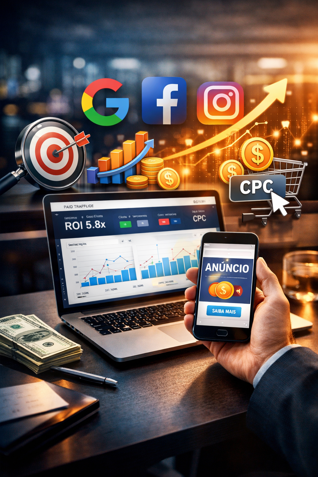 Cuidamos de tudo: planejamento das campanhas, criação dos anúncios, segmentação avançada, acompanhamento diário e otimizações constantes. Isso significa mais cliques qualificados, mais conversões e um retorno sobre investimento que você sente no faturamento.